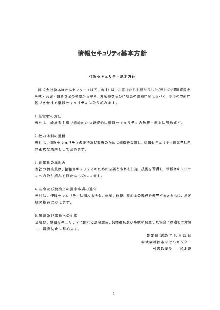 弊社の個人情報の取扱いおよび安全管理に係る適切な措置については、適宜見直し、改善いたします。